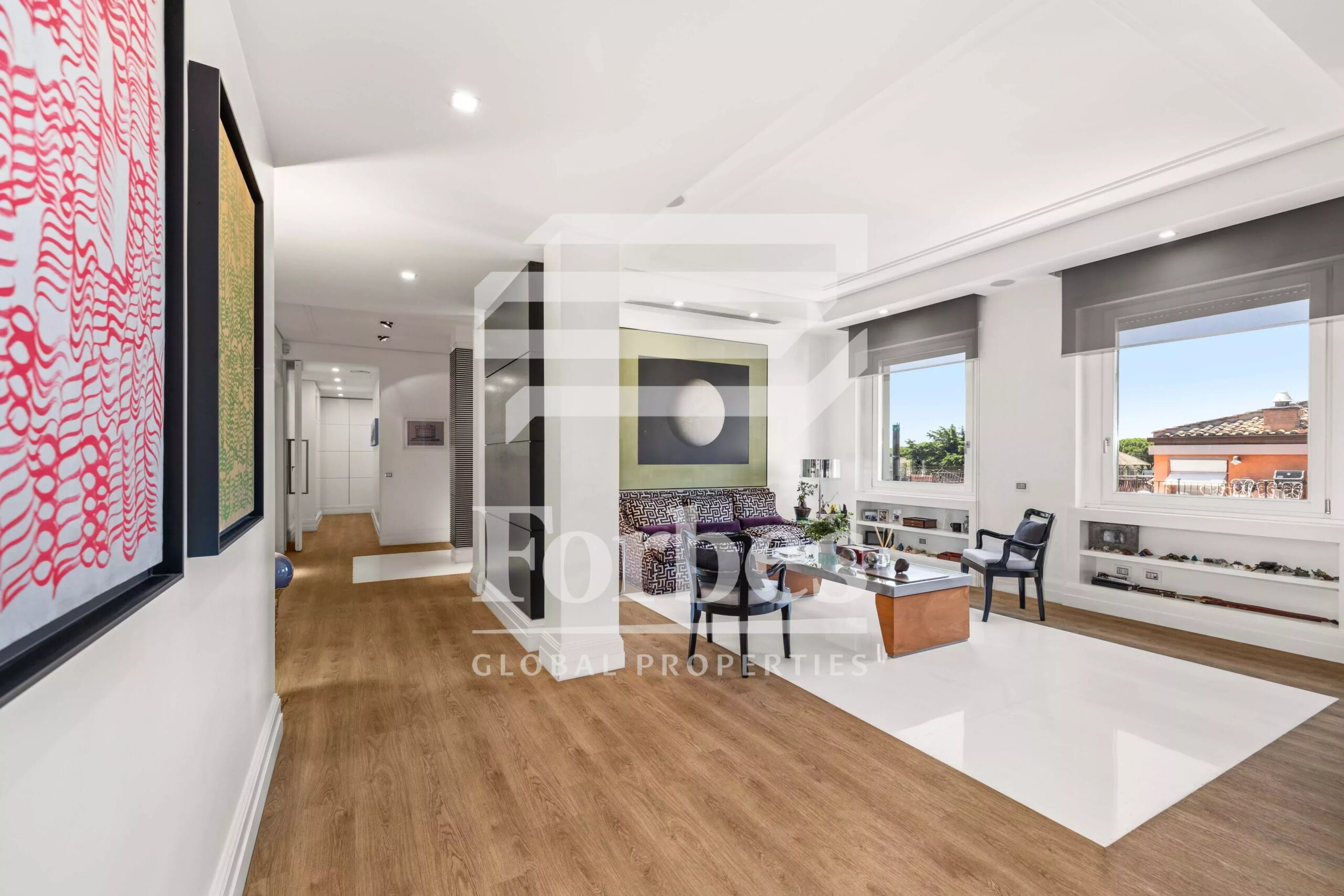Στην καρδιά αυτής της συνοικίας, στο ψηλότερο σημείο που βλέπει προς τη Villa Borghese, πωλείται ακίνητο στον τέταρτο όροφο ενός πενταώροφου κτιρίου που ολοκληρώνεται με υπερυψωμένη σοφίτα. Το διαμέρισμα καταλαμβάνει ολόκληρο τον όροφο του κτιρίου και έχει αποτελέσει αντικείμενο ενός μεγάλου έργου ανακαίνισης από τον αρχιτέκτονα Busiri Vici.