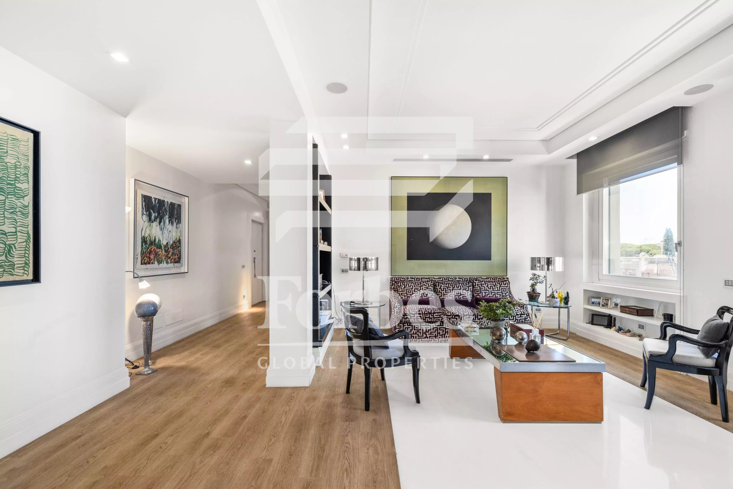 El piso es muy representativo, empezando por el vestíbulo de entrada, siguiendo por el salón triple desde el que se accede directamente al comedor. Alejados de la zona de estar se encuentran los dormitorios, todos ellos con vestidor y cuarto de baño privado con ducha y bañera de hidromasaje. Los grandes ventanales y la distancia de los edificios circundantes hacen que este piso sea extremadamente luminoso. En las cuatro esquinas, cuatro balcones ofrecen una pequeña y rara salida al exterior en un barrio caracterizado por edificios históricos sin espacios al aire libre.