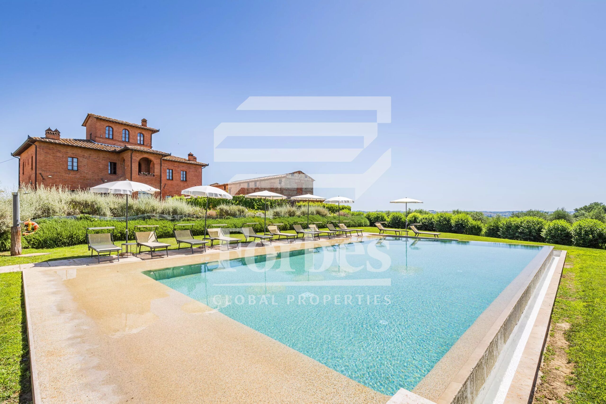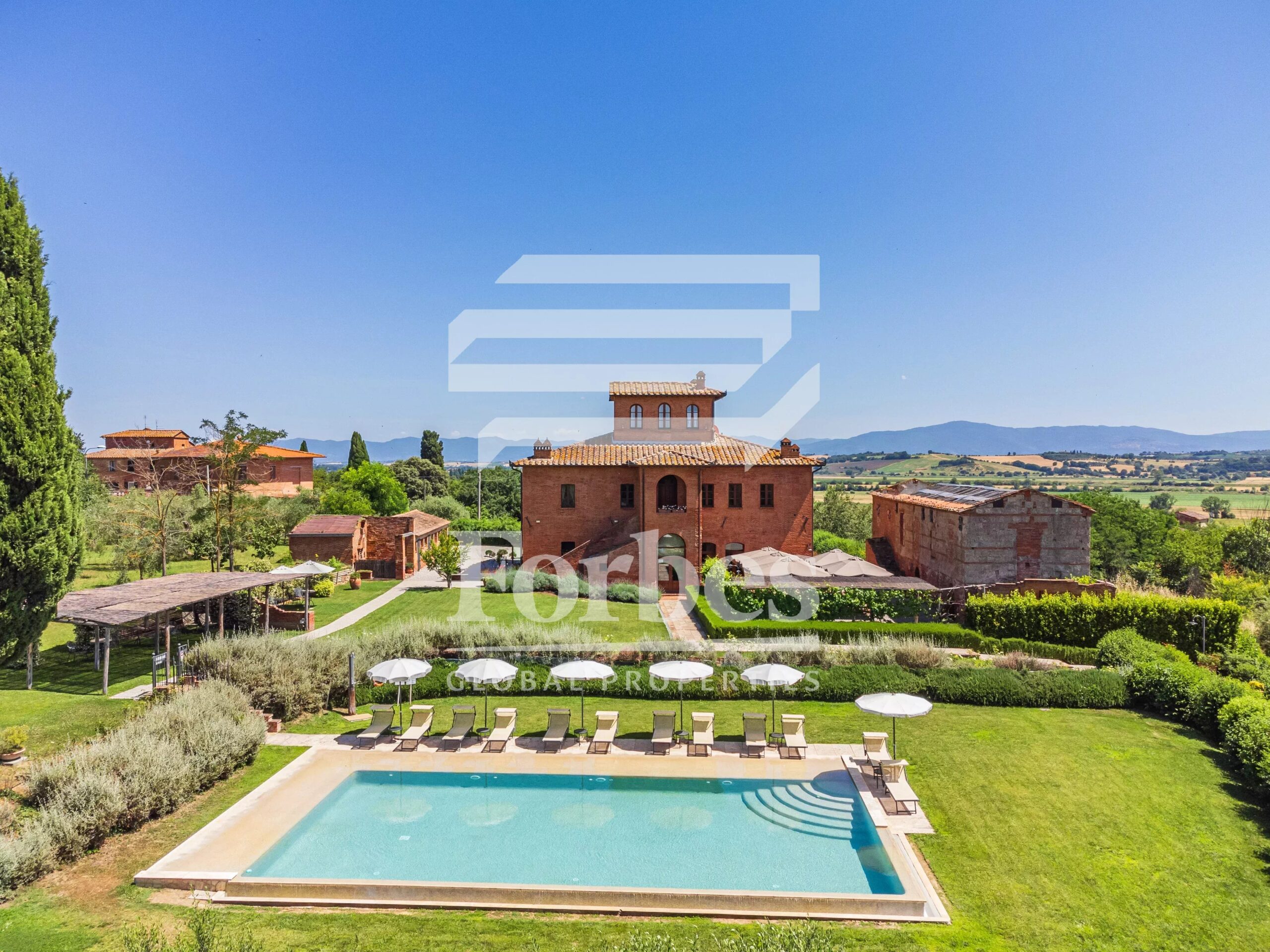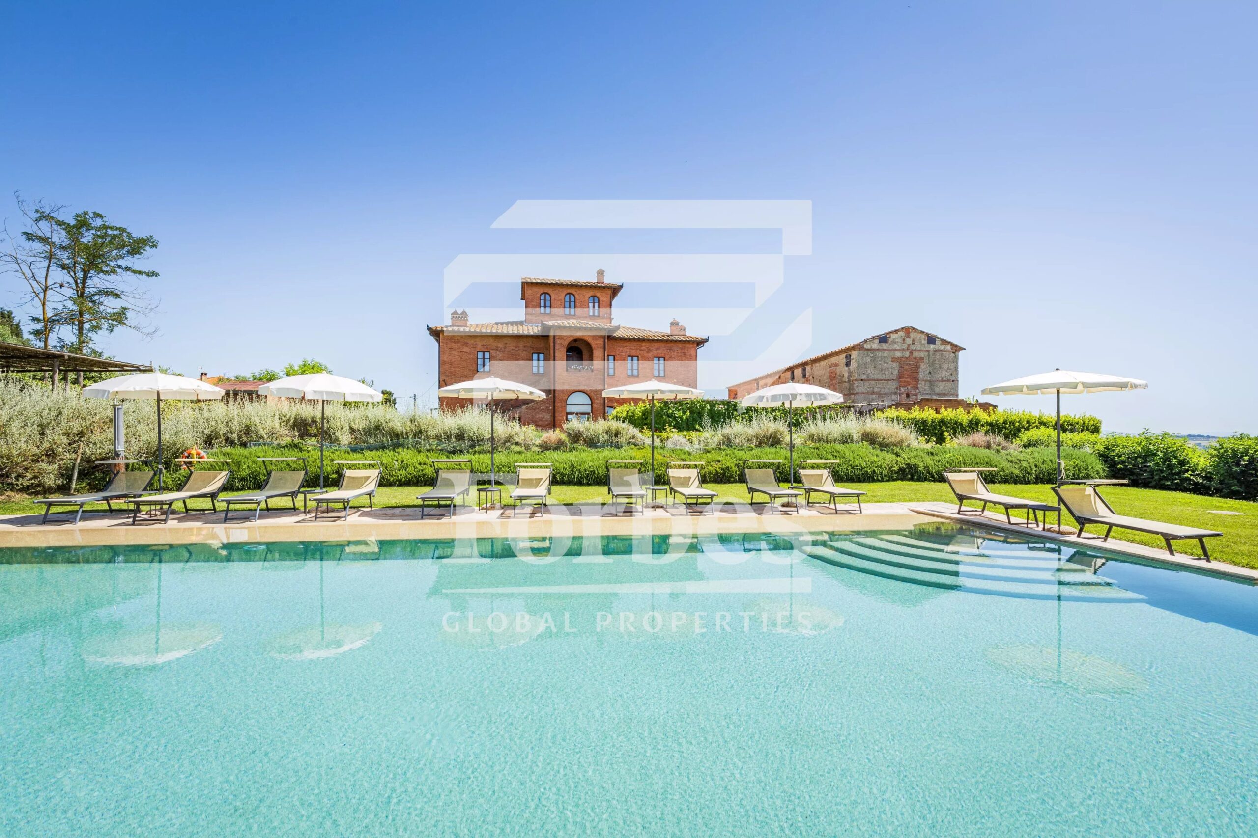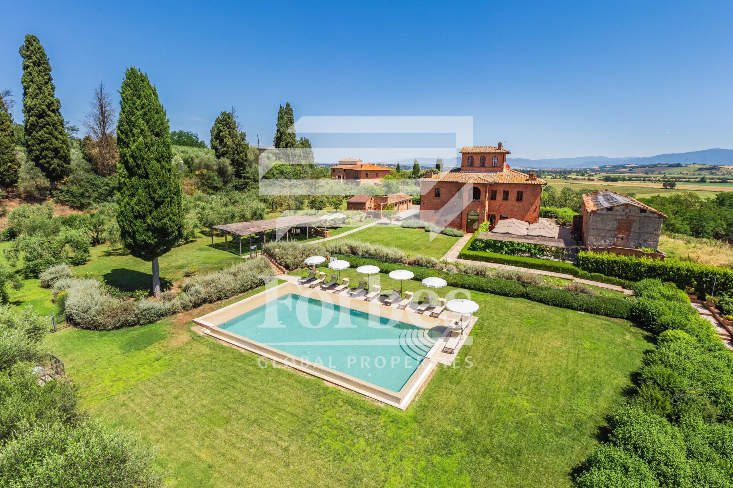 All’esterno, una grande terrazza pavimentata in cotto offre un’incantevole vista sul giardino, che ospita una splendida piscina e varie pergole ombreggianti ideali per rilassarsi nelle calde giornate estive o per piacevoli colazioni e cene all’aperto.