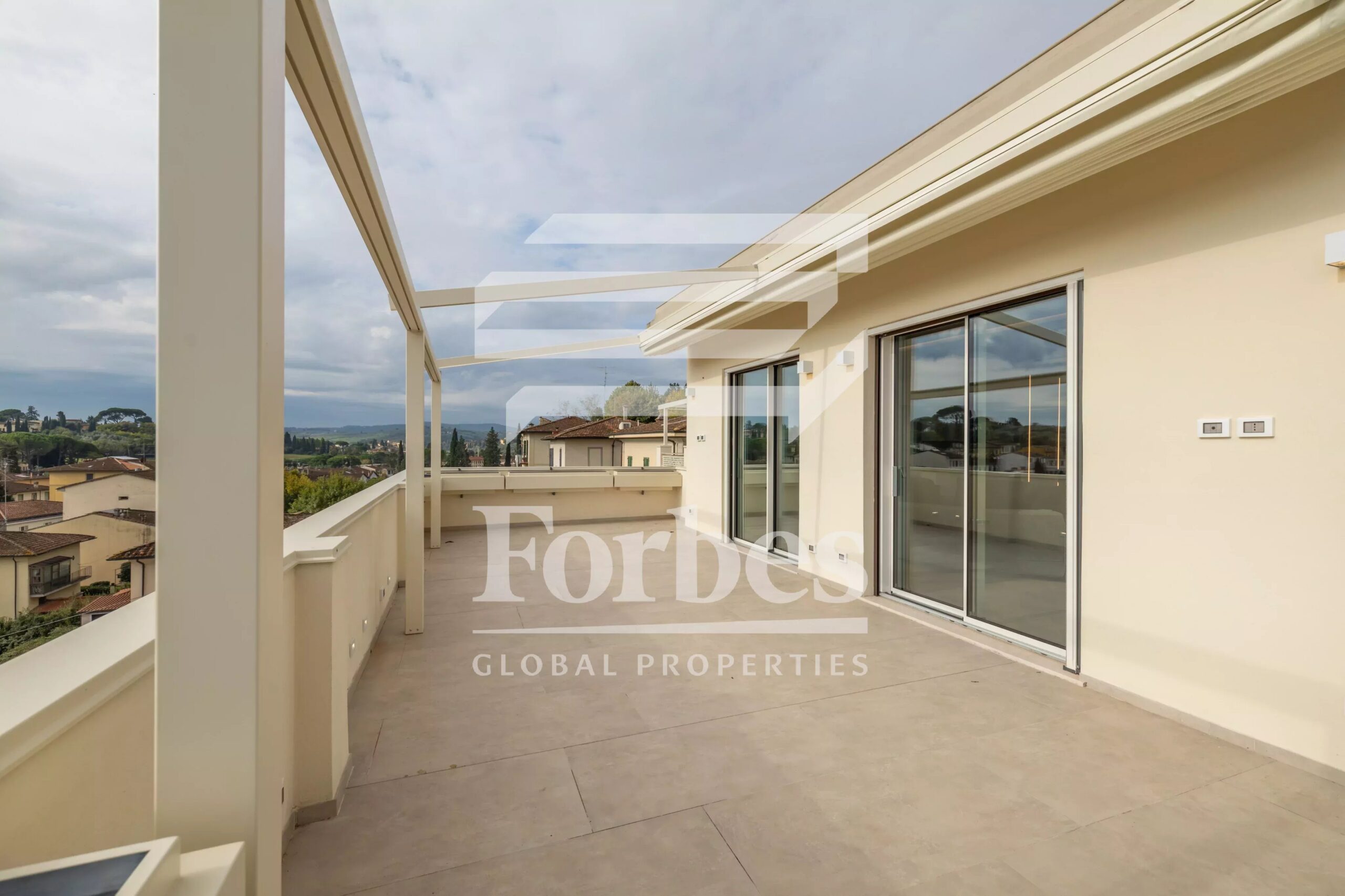 Μεγάλα συρόμενα παράθυρα ανοίγουν από το καθιστικό σε υπέροχες πανοραμικές βεράντες, προσφέροντας εκπληκτική θέα στον ορίζοντα της Φλωρεντίας και το γύρω τοπίο. Εδώ υπάρχει ένα βολικό αυτόματο σύστημα άρδευσης. Επιπλέον, η γωνιά χαλάρωσης με τζακούζι επιτρέπει στιγμές καθαρής ευεξίας μέσα στο πράσινο. Οι ηλεκτρικές περσίδες και οι μηχανοκίνητες τέντες επιτρέπουν τη βέλτιστη ρύθμιση του φυσικού φωτισμού, καθώς και την εξασφάλιση της μέγιστης ιδιωτικότητας.