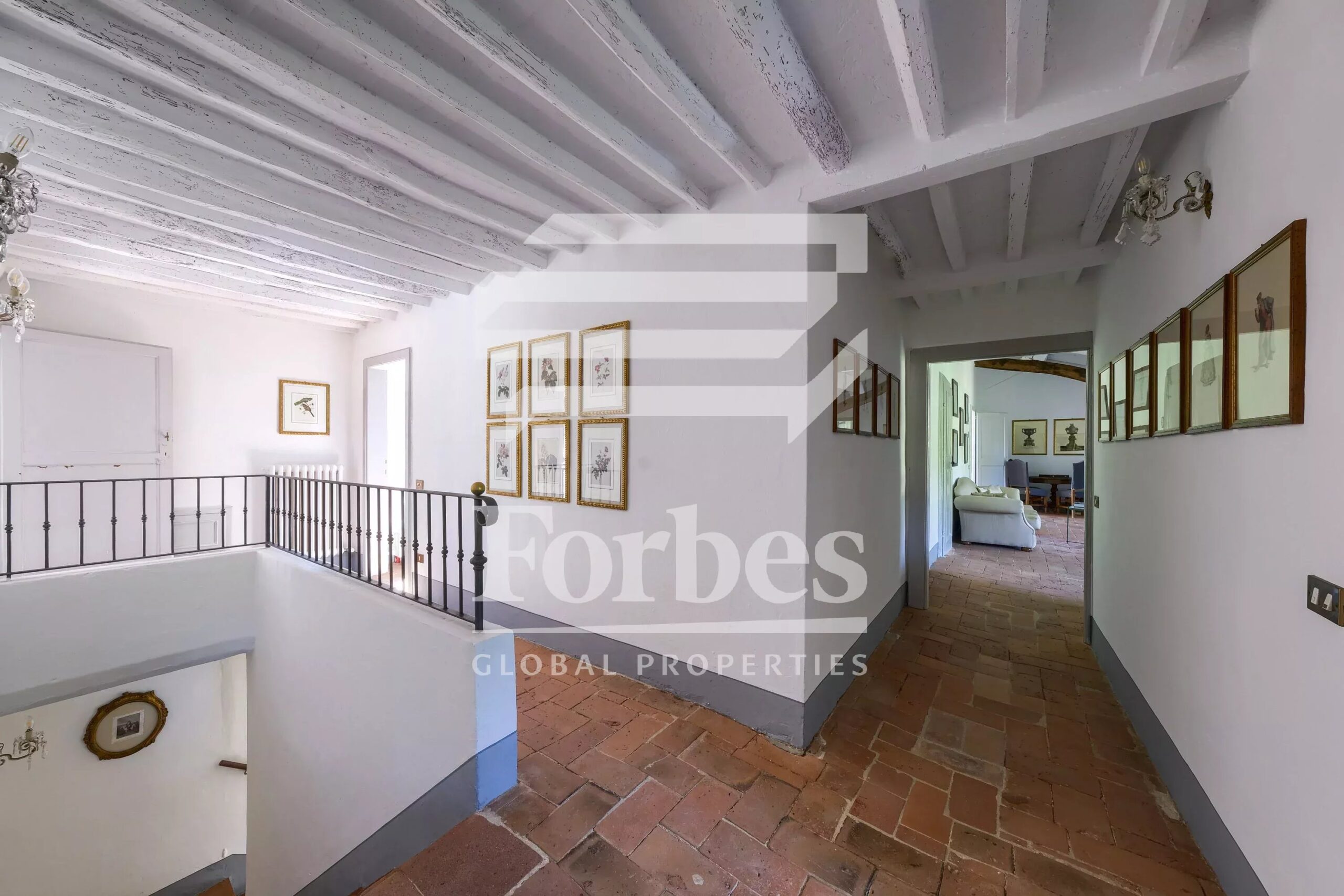 The farmhouse spans two levels and has been recently renovated in a chic country style by the owners. The ground floor features a bright double living room, a spacious kitchen with direct access to the courtyard and back garden, a bedroom with a bathroom, a laundry room, and a garage. The first floor houses the sleeping area with five bedrooms and three bathrooms.