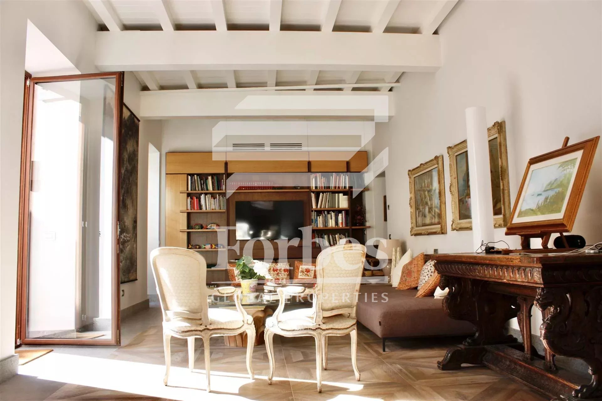 Moving to the second floor, you’ll find the entire master bedroom area, including a suite with a bathroom and a lofted TV area and balcony overlooking the private, tranquil, and bright courtyard, along with two other double bedrooms with ample windows and a bathroom.