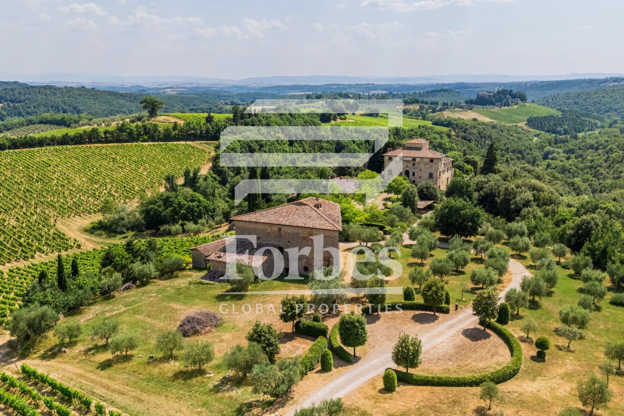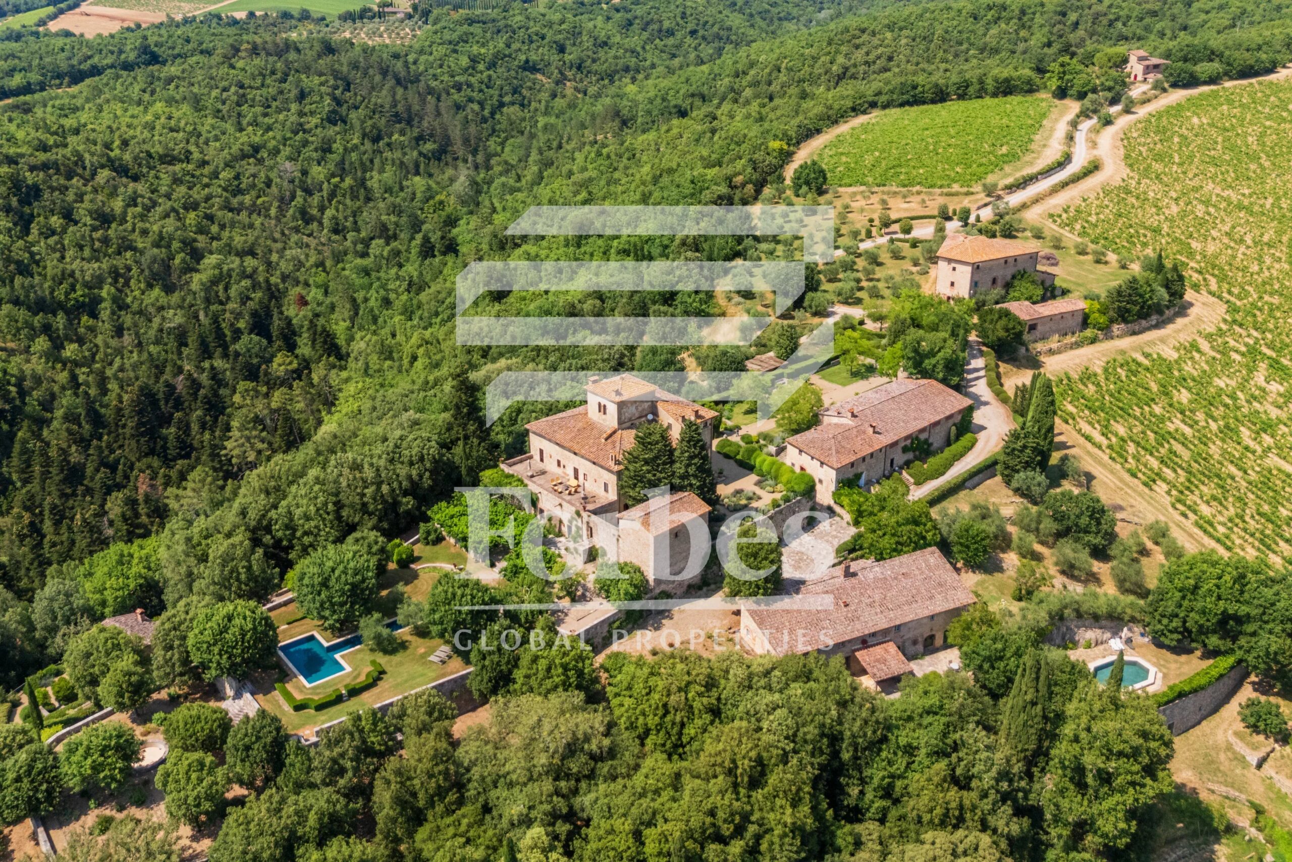 Το ακίνητο εκτείνεται σε περίπου 10 εκτάρια γης, με παραγωγικές δασικές εκτάσεις και ελαιώνες, και αποτελείται από τέσσερα ξεχωριστά κτίρια, συμπεριλαμβανομένης μιας κύριας βίλας με ιδιωτική πανοραμική πισίνα, μιας αγροικίας με δεύτερη πισίνα, ενός ανακαινισμένου πρώην αχυρώνα με γκαράζ και πέτρινο λεμονοστάσιο, καθώς και ενός ιστορικού καθαγιασμένου παρεκκλησίου.