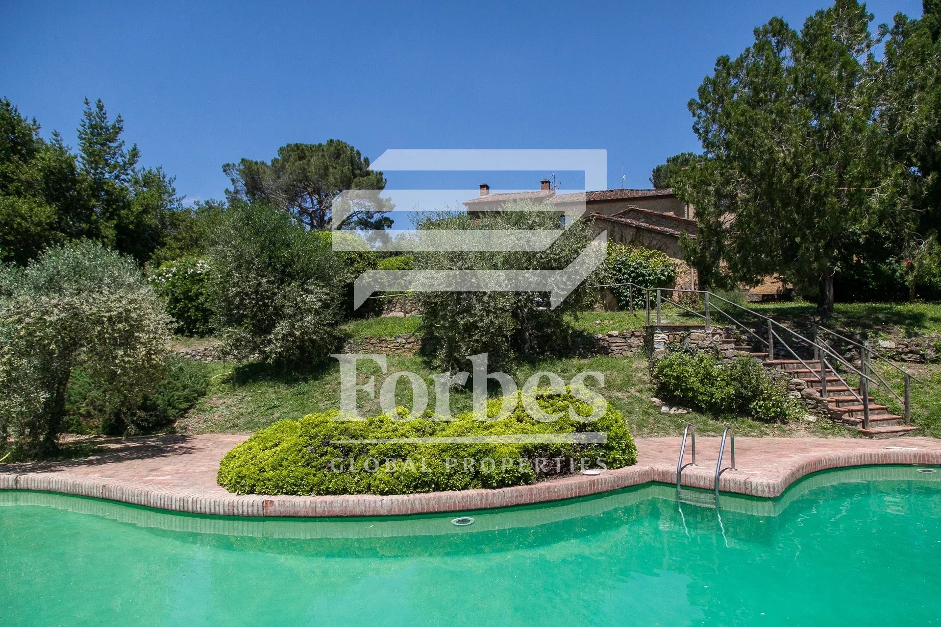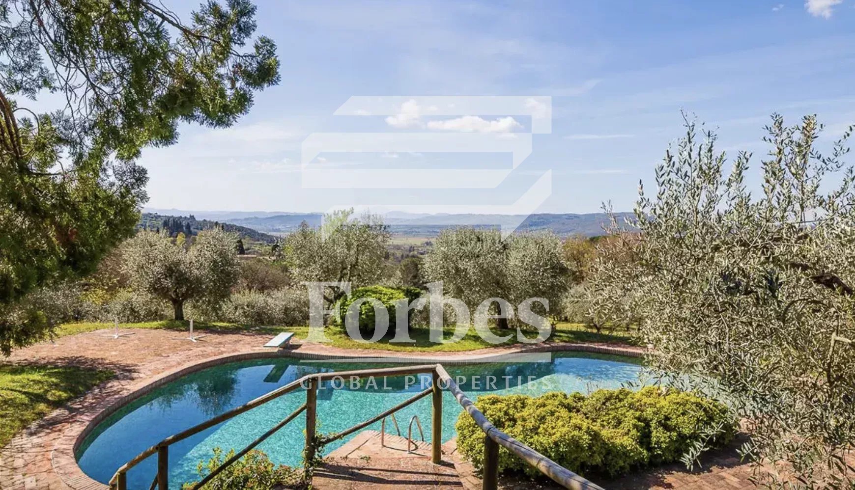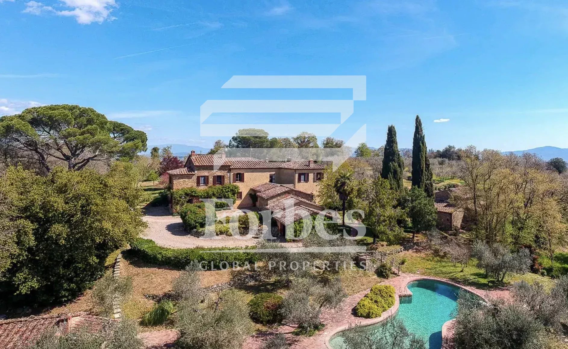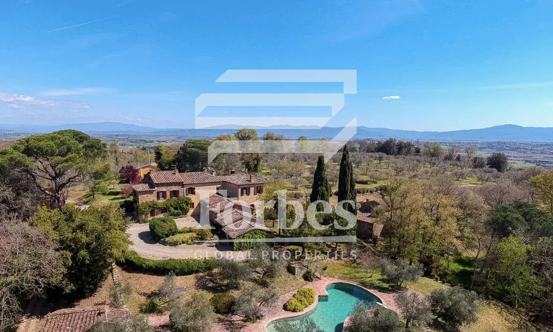 This prestigious estate spans 1,000 square meters of interior space and includes a main villa, a 160-square-meter open-space guest residence on two levels, and a 130-square-meter staff house with three bedrooms. The property is completed by a modern 40-square-meter fitness and spa area and a charming panoramic pool offering breathtaking views of the Tuscan countryside.