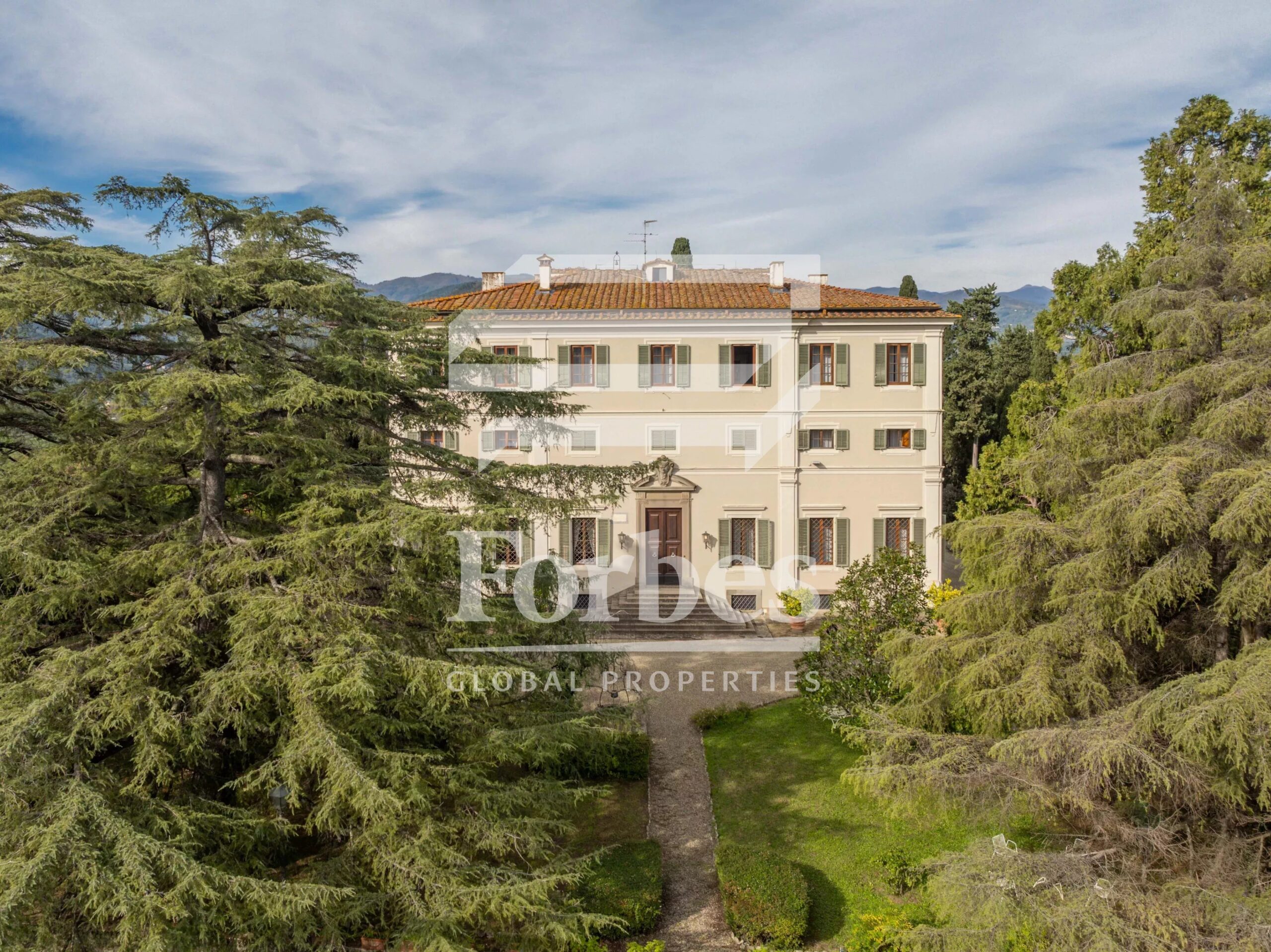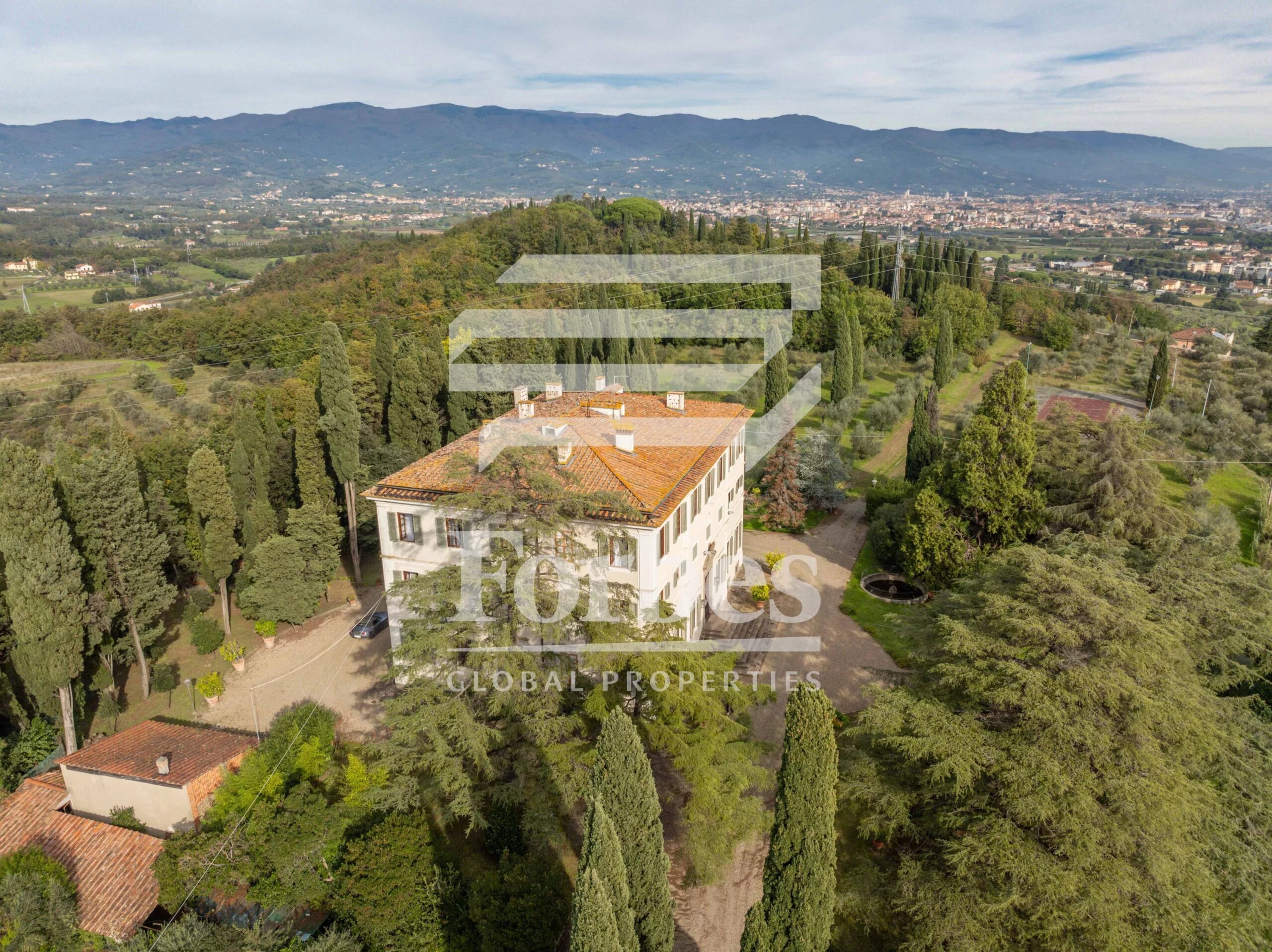 Surrounded by beautiful gardens with panoramic views, the villa for sale overlooks a breathtaking landscape that, on the clearest days, allows a glimpse of the dome of Florence Cathedral and the entire plain stretching to the Serravalle towers to the west. The interior of the mansion is fully decorated with frescoes depicting mythological scenes and enchanting landscapes, interspersed with architectural decorations.