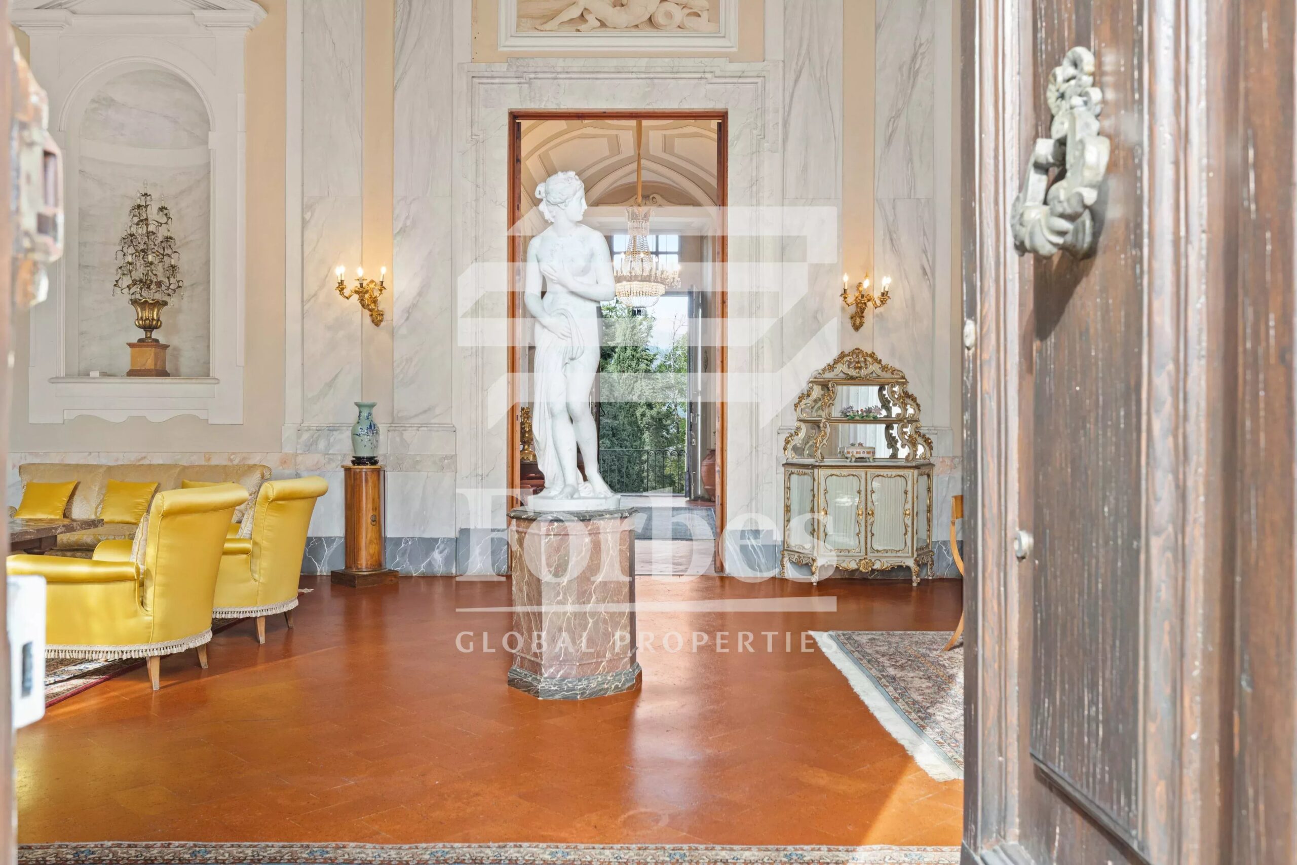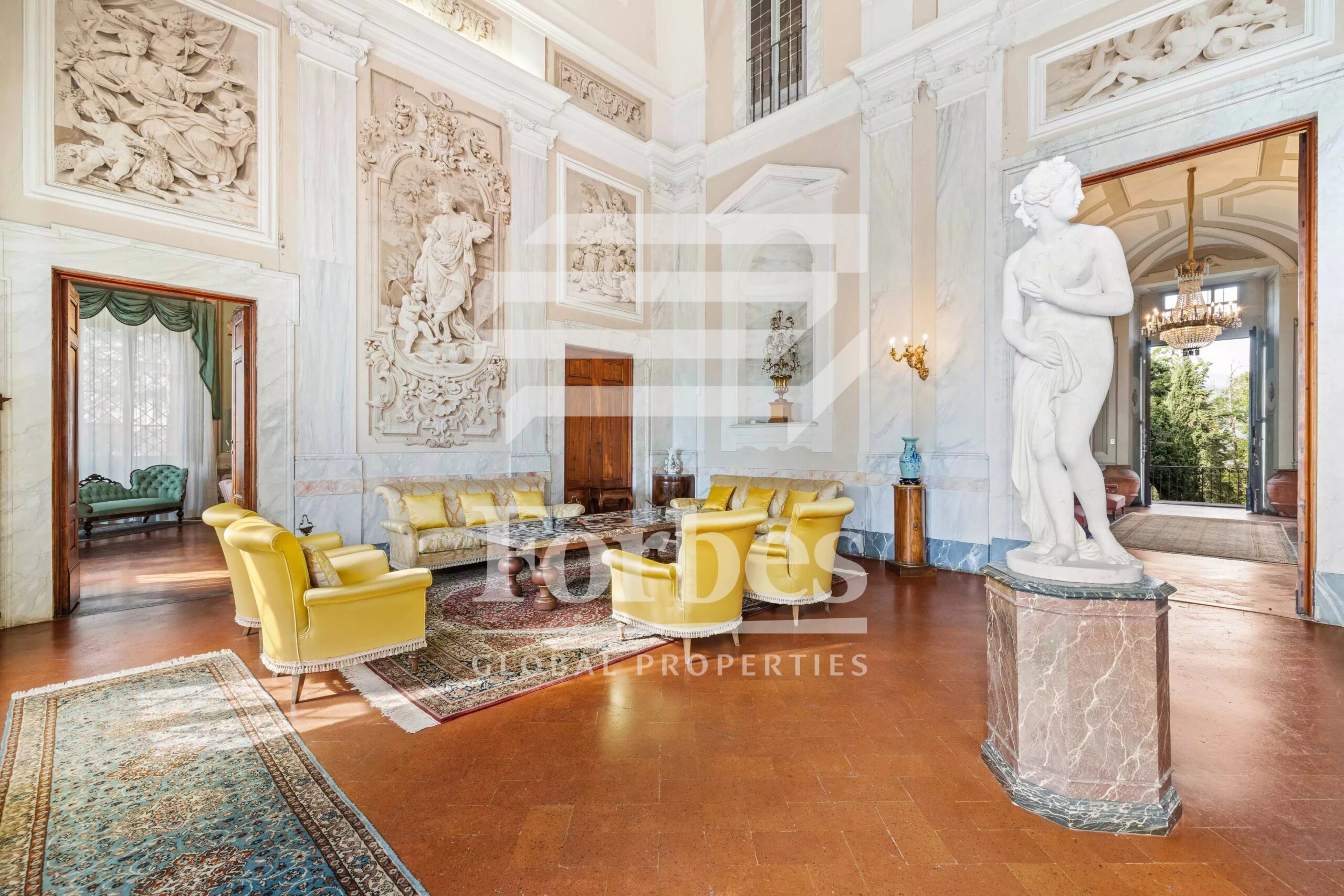 The property is on four levels, including two noble floors and a mezzanine, as well as a basement that houses the kitchens and cellars. The various floors are connected by a wide staircase and an elevator. The villa preserves its interiors almost intact.