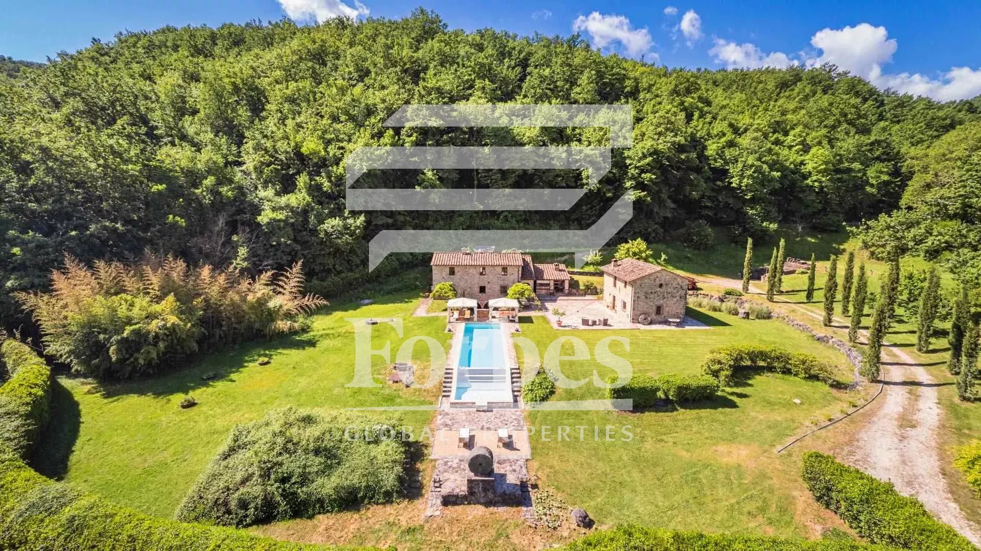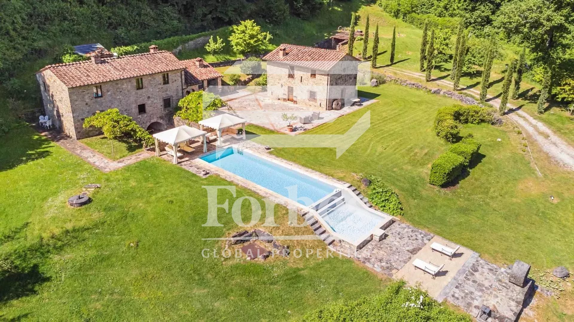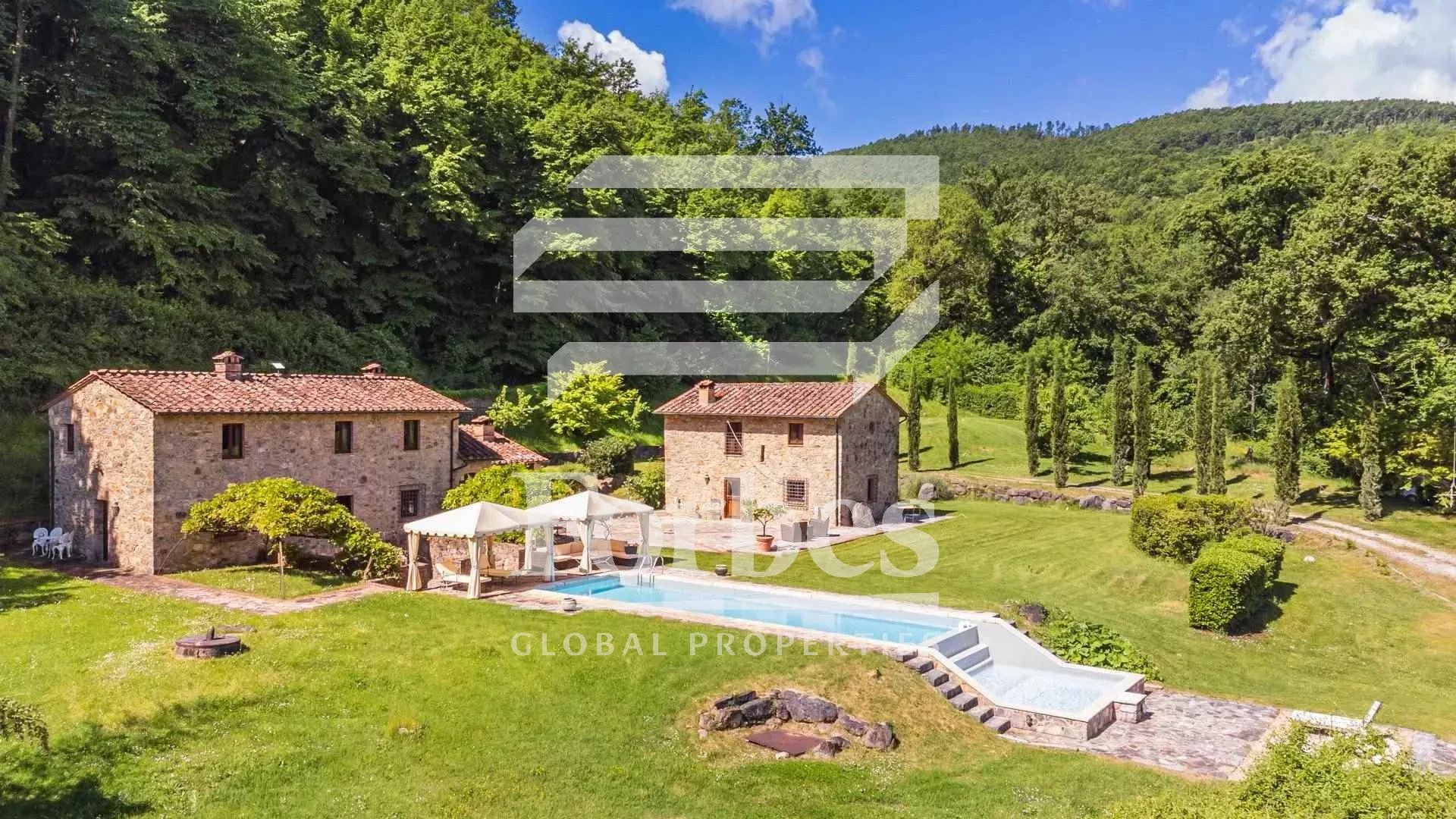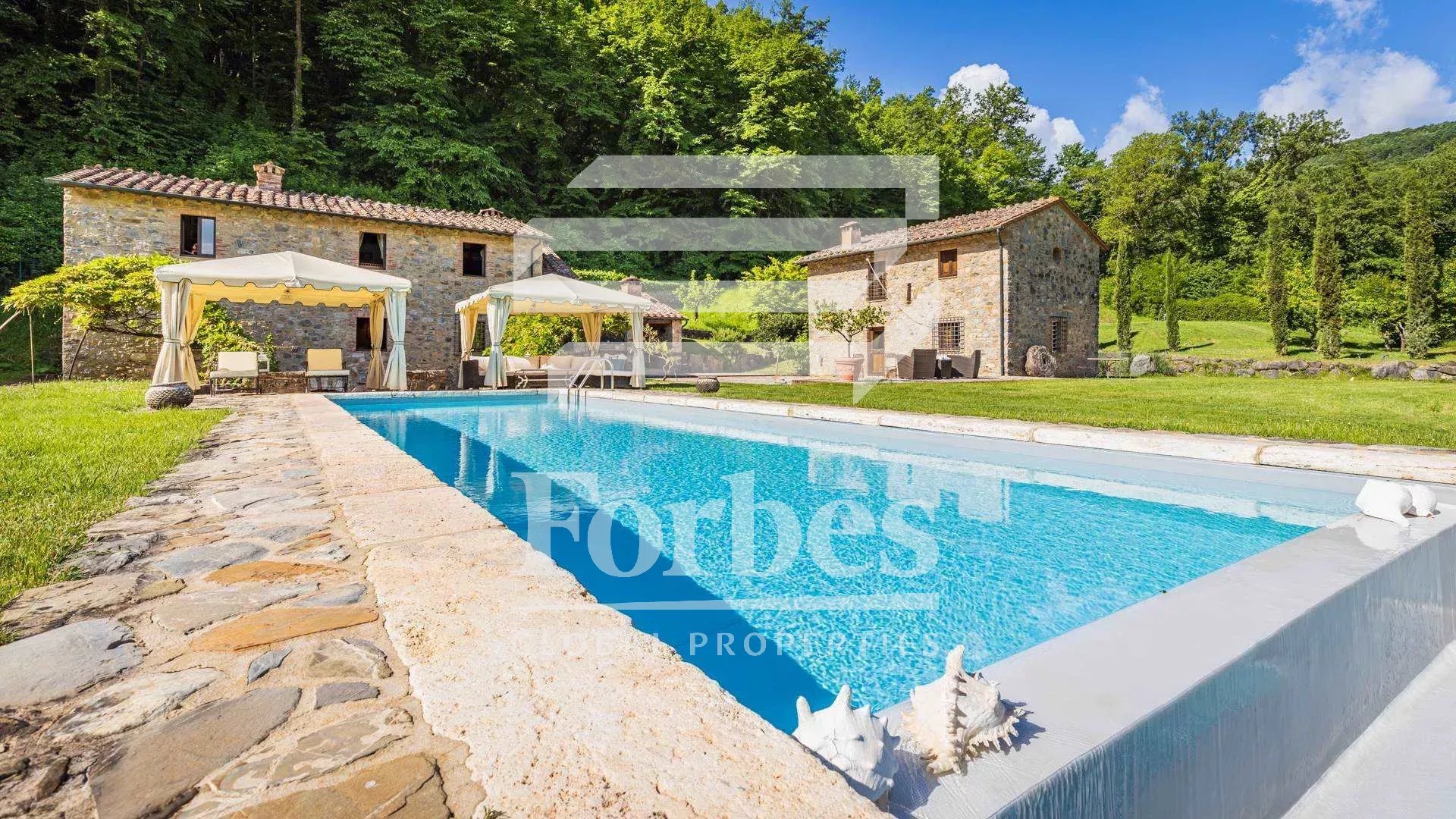 Das luxuriöse Anwesen, das ursprünglich eine Mühle war, besteht aus einem Hauptgebäude und einem Nebengebäude sowie einem Wellnessbereich, einem privaten Swimmingpool und einer Tiefgarage.