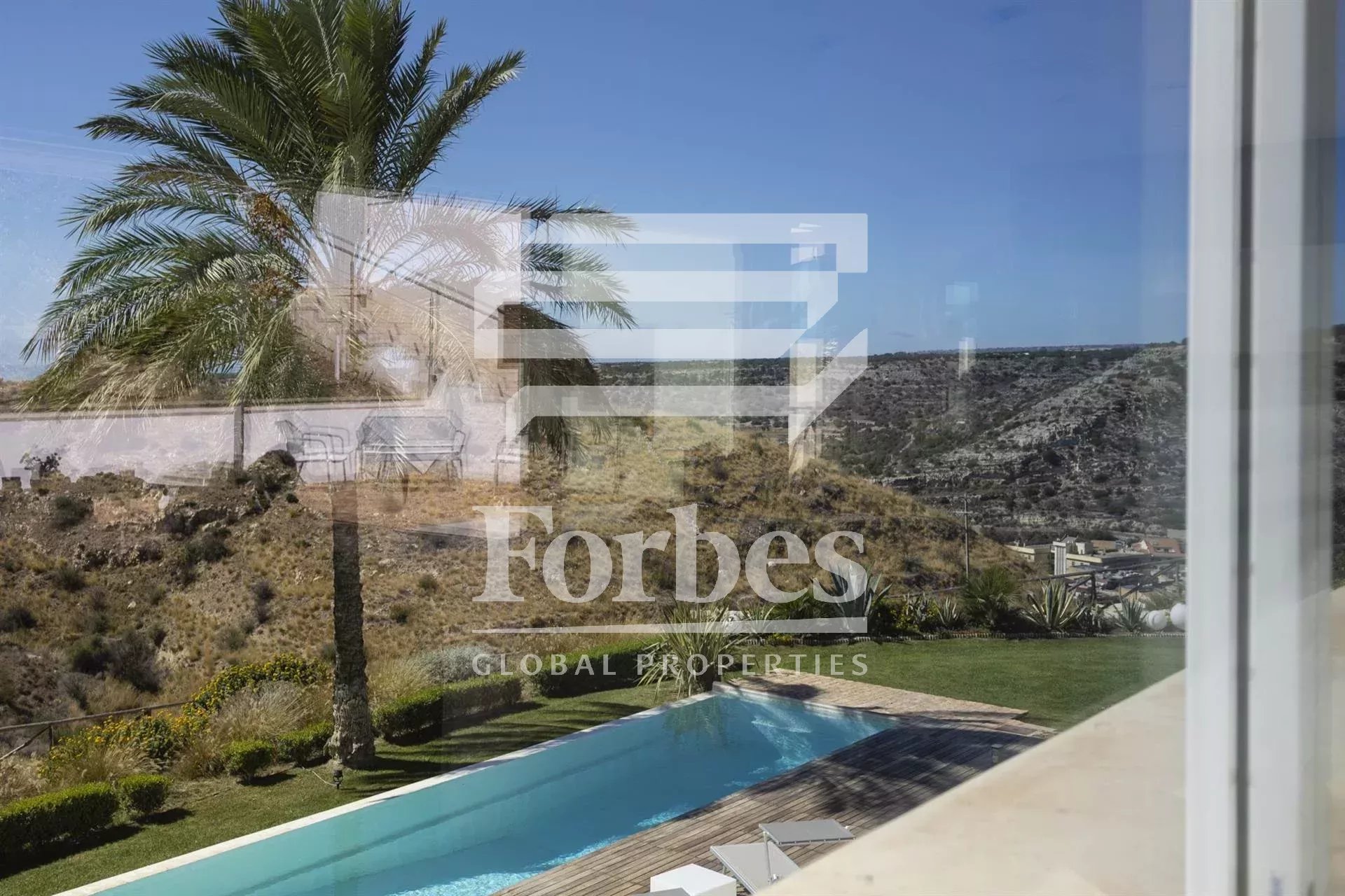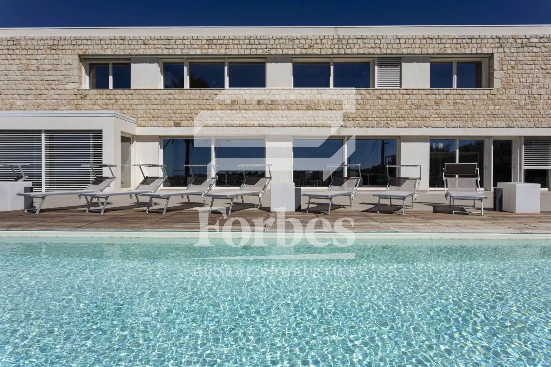 The recently built home is designed to offer a high-level living experience: spacious interiors, large windows that encourage natural light and a harmonious connection between indoor and outdoor spaces make this villa a true haven of well-being and privacy. The property is spread over two levels: the ground floor features refined and communicating living spaces, a professionally equipped kitchen, service areas such as laundry, pantry and wine cellar, as well as offices and two bathrooms; the upper floor, on the other hand, features four double bedrooms with en-suite bathrooms, a spacious living area with an island kitchen, dining room and direct access to a large panoramic terrace offering unparalleled views of the surrounding landscape.