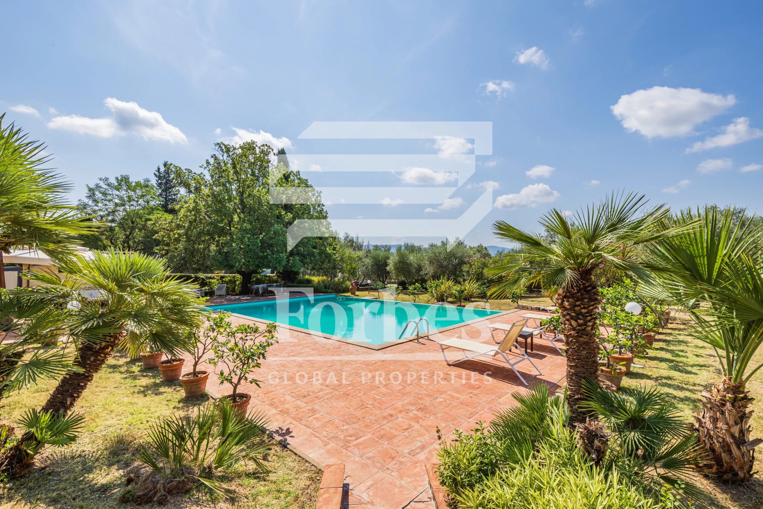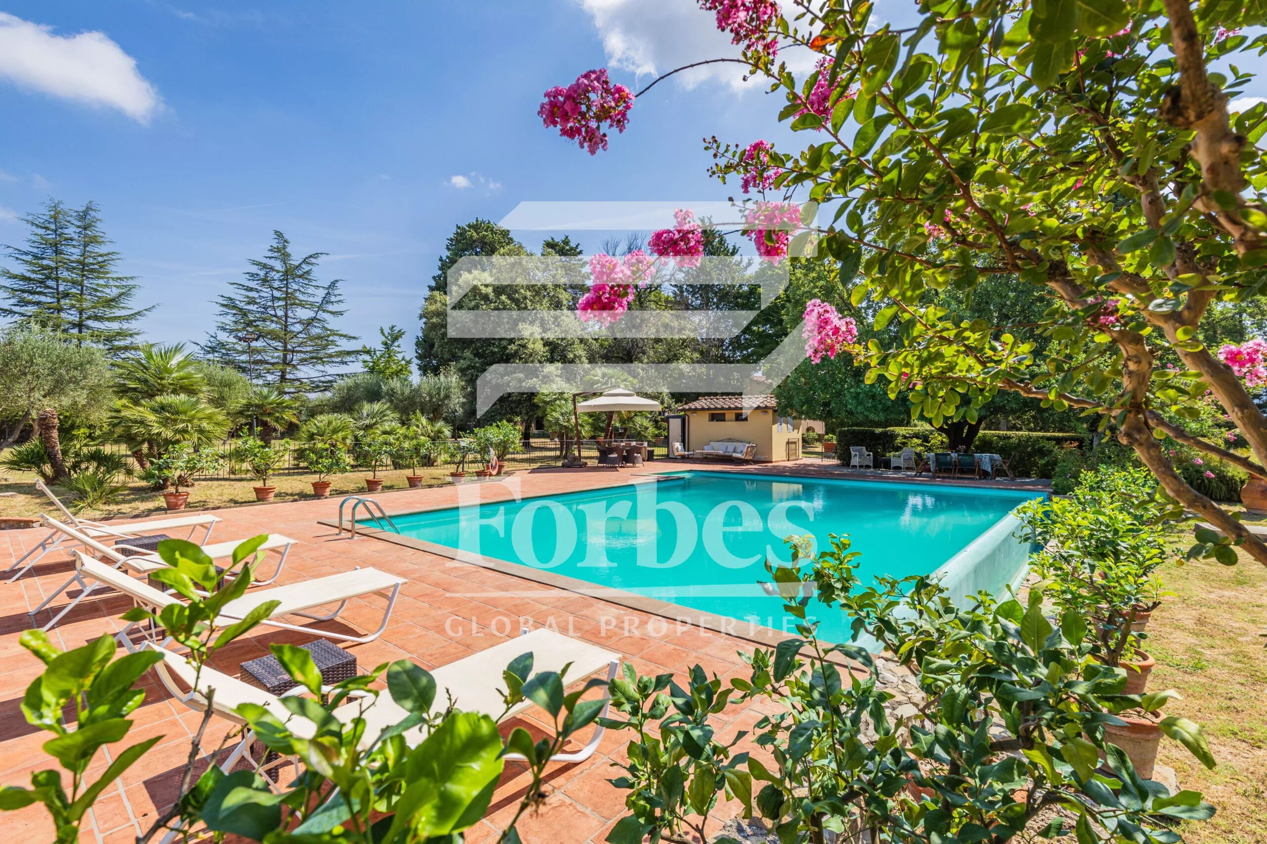 This prestigious property is completed by an enchanting garden with a swimming pool and approximately 14 hectares of land, including 0.5 hectares of arable land, 3.8 hectares of vineyard ready for replanting, and 9 hectares of olive groves, which surround the villa in an oasis of tranquility and privacy.